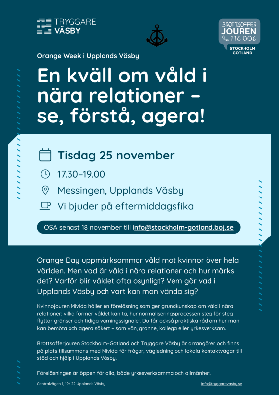 Den 25 november är Orange Day, den internationella dagen för att uppmärksamma våld mot kvinnor. Tillsammans med Mivida och Brottsofferjouren bjuder vi in till en kväll för både yrkesverksamma och boende, där vi lyfter kunskap, erfarenheter och hur vi kan agera när någon far illa.